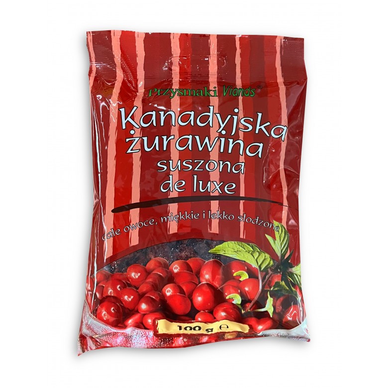 Żurawina suszona lekko słodzona VIANDS - żurawina wielkoowocowa (vaccinium macrocarpon) o charakterystycznym cierpkim smaku, uprawiana rdzennie na północy kontynentu amerykańskiego, to bogactwo przeróżnych substancji wspomagających organizm w zapobieganiu rozmaitym schorzeniom, począwszy od przeziębień, przez choroby serca, wrzodowe i dziąseł, do infekcji układu moczowego. Żurawina powinna stanowić składnik codziennej diety. Suszona znajduje zastosowanie jako przekąska, dodatek do deserów, płatków śniadaniowych, ciast, lodów jak również jako składnik sosów i dodatków do mięs.