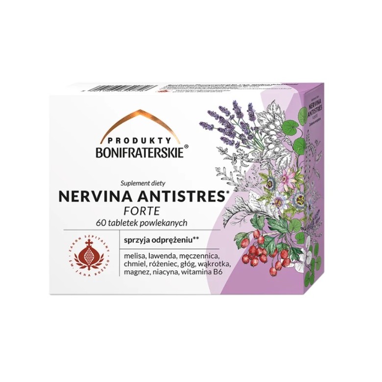 Nervina antistres FORTE BONI FRATRES to preparat oparty na zakonnej recepturze i doświadczeniu Braci Zakonu Bonifratrów. Składniki zawarte w preparacie sprzyjają odprężeniu i pomagają zmniejszyć drażliwość, pomagają zmniejszyć napięcie, zrelaksować się oraz odprężyć, przyczyniają się do prawidłowego funkcjonowania układu krążenia. Niacyna i Witamina B6 pomagają w prawidłowym funkcjonowaniu układu nerwowego, a chmiel zwyczajny zawarty w preparacie ma kojący wpływ na układ nerwowy. Dodatkowo witamina B6 przyczynia się do zmniejszenia uczucia zmęczenia i znużenia.
