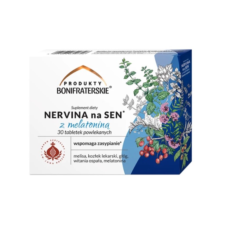 NERVINA na SEN z melatoniną suplement diety to preparat oparty na zakonnej recepturze i doświadczeniu Braci Zakonu Bonifratrów. Melatonina pomaga w skróceniu czasu potrzebnego na zaśnięcie.