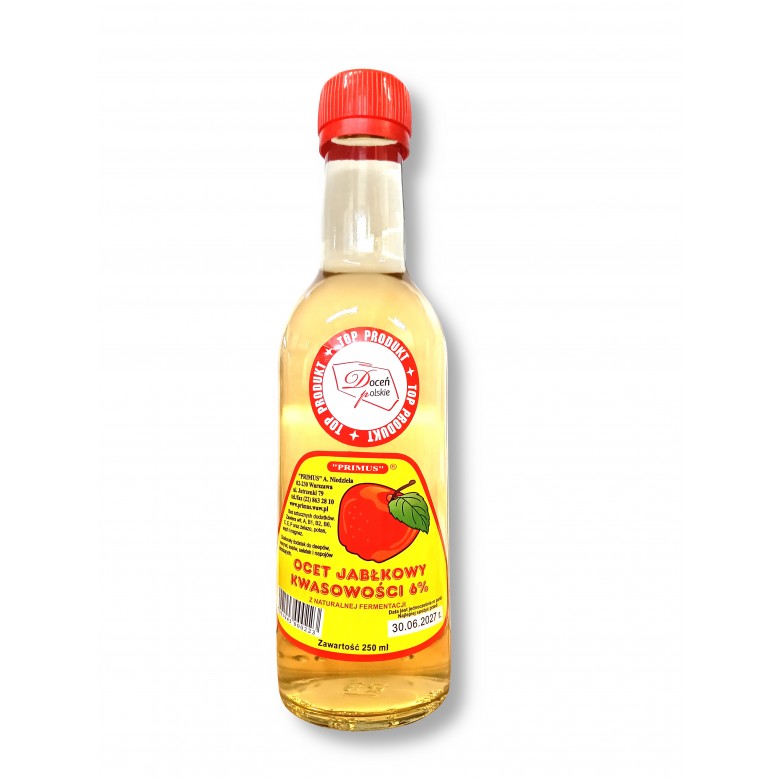 Ocet jabłkowy 6% PRIMUS to źródło witamin: A, B1, B2, B6, C, E, P, beta-karotenu oraz żelaza, potasu, fluoru, chloru, miedzi, wapnia, magnezu, sodu, fosforu i krzemu. Ocet jabłkowy posiada bogate właściwości zdrowotne, dzięki zawartym w nim związkom mineralnym, enzymom i aminokwasom uzupełnia składniki biorące czynny udział we wszystkich procesach życiowych.